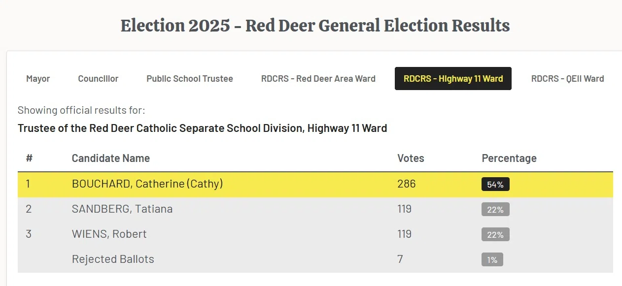 Cathy Bouchard has won election to the Red Deer Catholic School Division (RDCRS)’s board of trustees, representing the Highway 11 Ward.