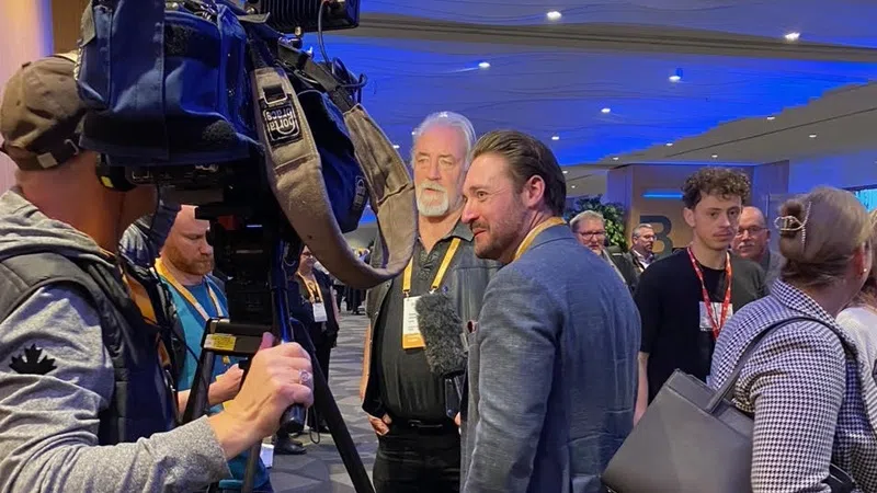 Rocky Mountain House Mayor Shane Boniface speaks to reporters at the Alberta Municipalities fall conference in Calgary, Nov. 13, 2025. (Denise Boniface)